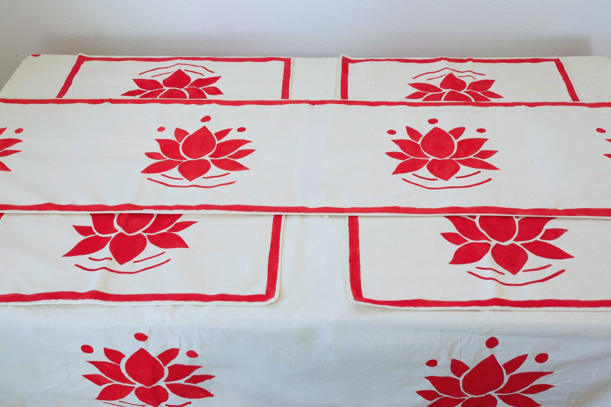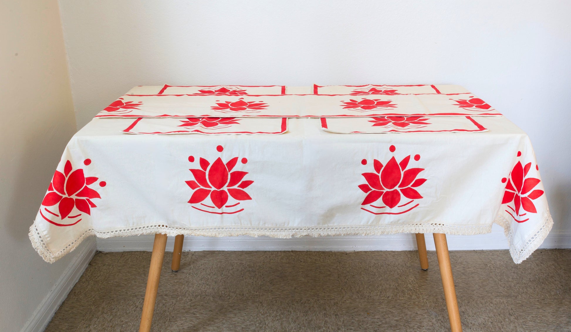 Handmade Lotus Tablecloth Set | Raw Cotton Table Runner, 4 Handpainted Placemats, Table Cover | Boho Dining Table Decor